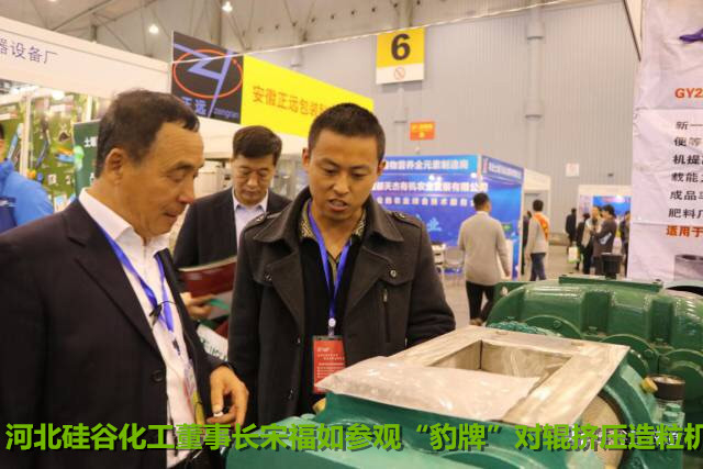 河北硅谷化工董事長宋福如、常務(wù)副總張鴻君、財(cái)務(wù)副總李銀昌參觀我公司“豹牌”對輥擠壓造粒機(jī)