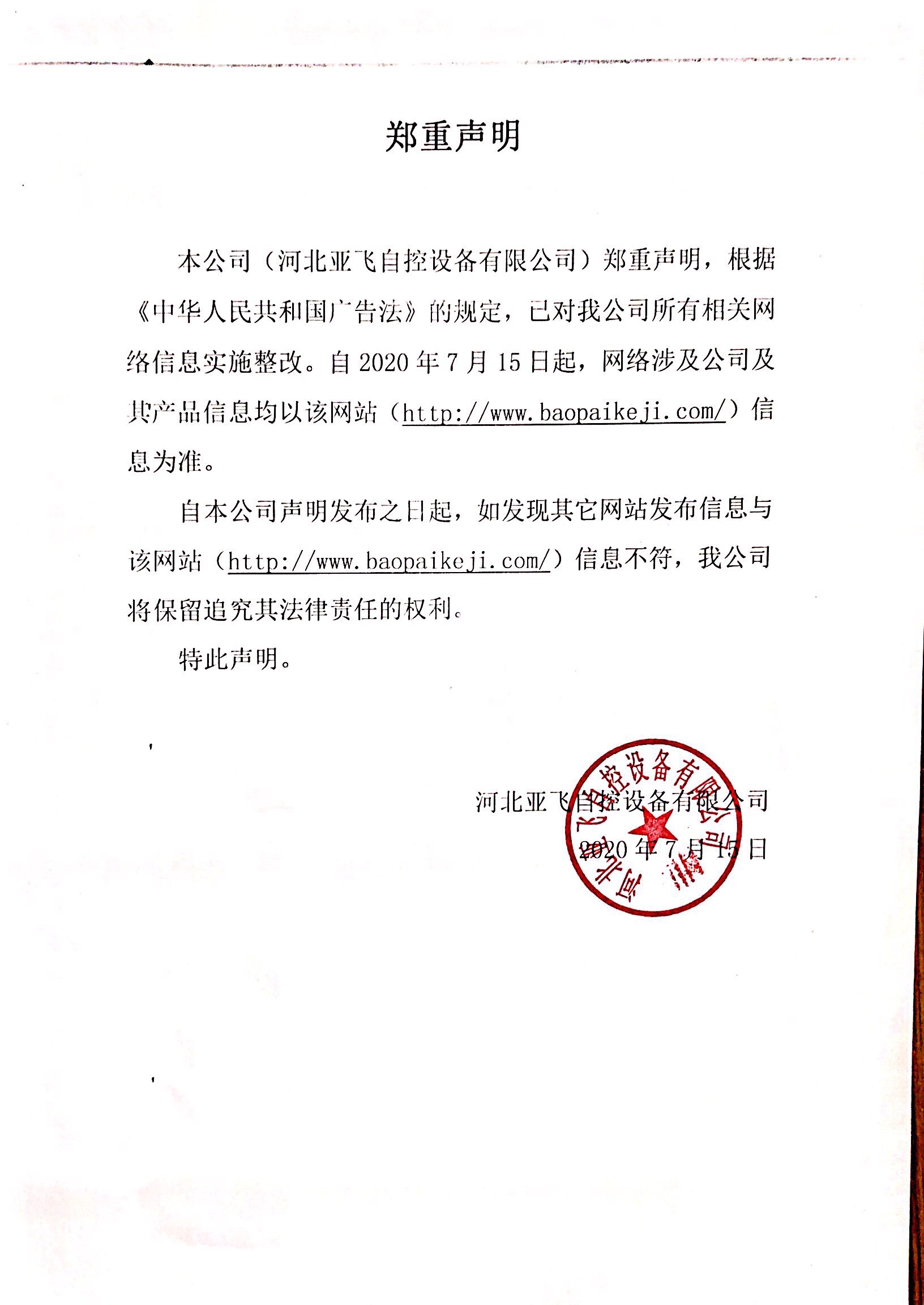 河北亞飛自控設備有限公司對相關網(wǎng)絡信息實施整改的鄭重聲明