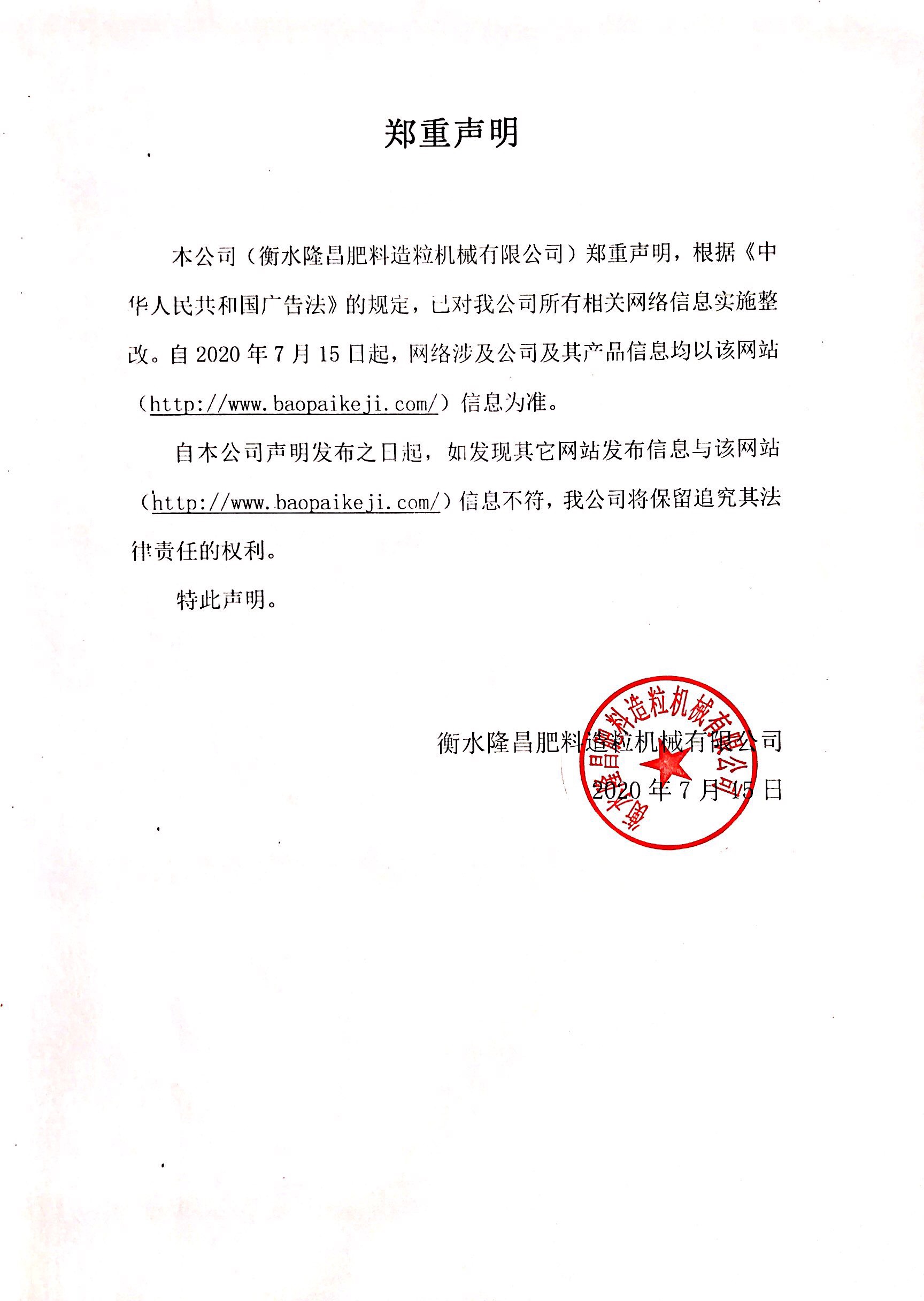 衡水隆昌肥料造粒機(jī)械有限公司對相關(guān)網(wǎng)絡(luò)信息實施整改的鄭重聲明